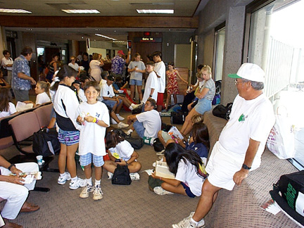 Ian waiting for a flight to a junior tennis tournament at the Kahalui Airport. Behind him are numerous others from Maui heading over for the tournament.