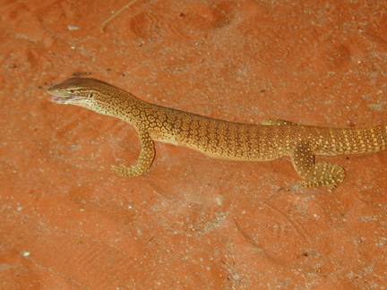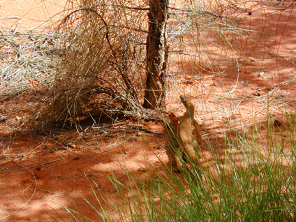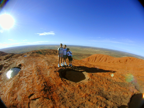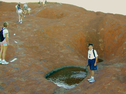up, wore away, and the basin was turned on its side and was covered again during the ice age then left again. This solid hard rock teems with life. About twice a year it rains in the desert. At the summit, 1,400 feet above, small water basins exist after heavy rains. These dry up within 20-30 days. In this time period triops and a small fish, not more than 3mm in length, have an entire life cycle. Ian found them ( of course)! The eggs of the animals have to survive dried up for sometimes years to be re-activated when washed into these small water catches. No one else seemed to know there were fish on Ayers Rock. None of the books we looked at mentioned them. We may have discovered a new species of fish. If so we'll have to call them Cooke fish.