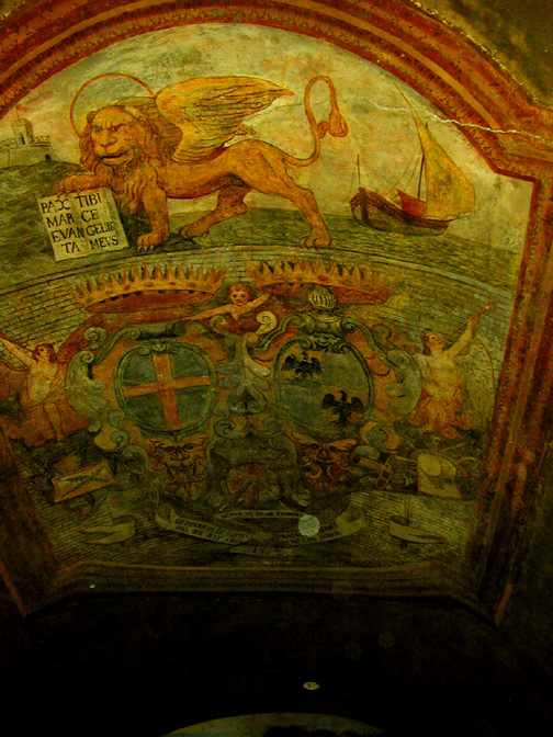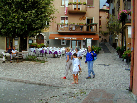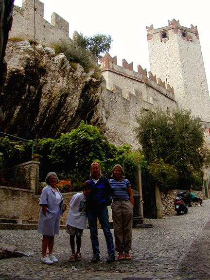 We stopped in at Lake Garda, on our way to Stresa, to visit an old friend of Pam's who lives there. Lake Garda was the retreat home of Mussolini (and was where he ran from to head to the Austria where he was eventually captured and killed at the end of WWII). Madelyn and Ed Murphy of Alameda ( and Pam's first tennis teacher) have a home in Cassone that has a million dollar view. Actually the postcards sold of Malcesine and Cassone come from pictures on their porch. Madelyn's family come from Cassone. Lake Garda is the windsurfing capital of Europe. It never snows at lake level but there are trams to the top of the mountain for winter skiing. Lake Garda was the principal inland port town for all goods headed for Venice and the Mediterranean Sea. A large and perfectly preserved castle still sits on the shoreline of Malcesine. On the ceiling of the entry to the city the port passage ( built in 1200 AD) ceiling bears timeless witness to the power and magnificence of Venice. Anytime one sees the crest of the "Lion with Wings" one knows Venice controlled this region. The town has become a mecca for Italians and other Europeans looking for a break from the hot summers and cold winters. Malcesine hosts these travelers in spotless streets and shops that all summer cater to the sailors, yachtsman, windsurfers and swimmers while in the winter it's a ski town. The water is amazingly warm all year long.
