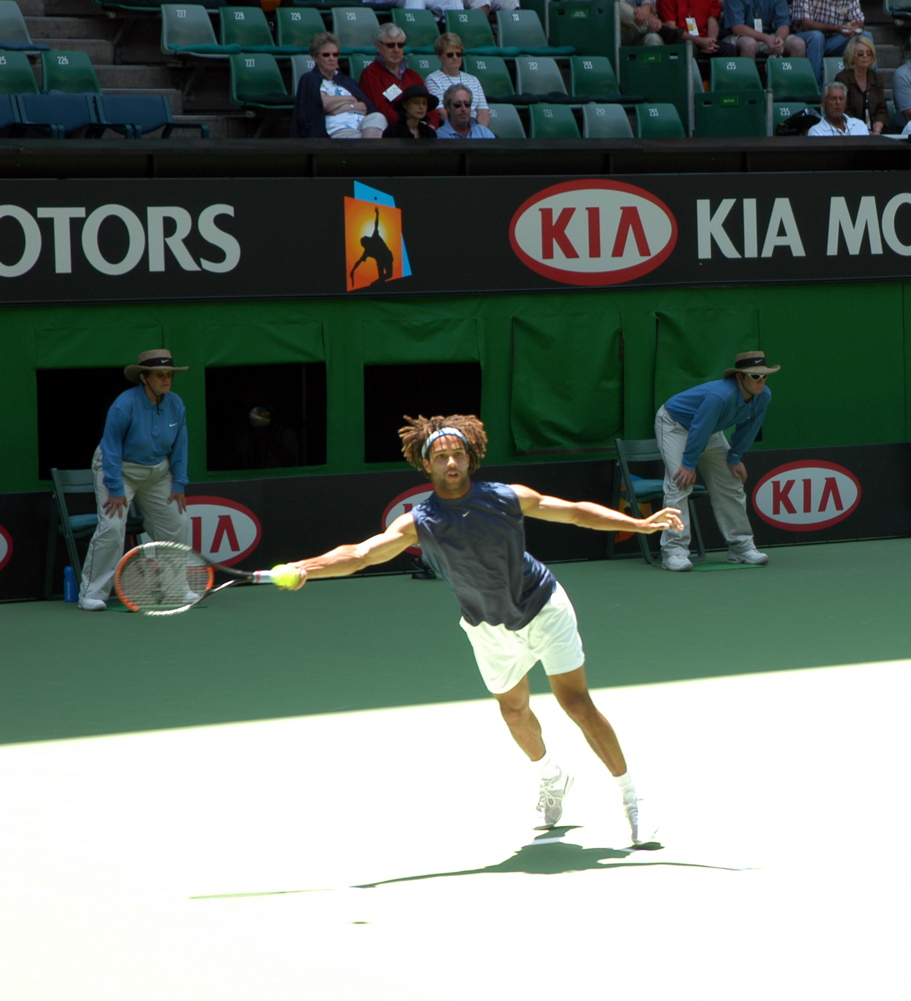 | | | | Agassi punishes a forehand. | Andre has been just too good for anyone. Nicholas Escude pushed Agassi by hitting extremely agressive returns and closing on the short defensive balls. This worked for a while but Escude was not in good enough shape to weather 5 sets as Agassi took the match in four. Nicholas may not have had the legs for five sets if it went that far. |