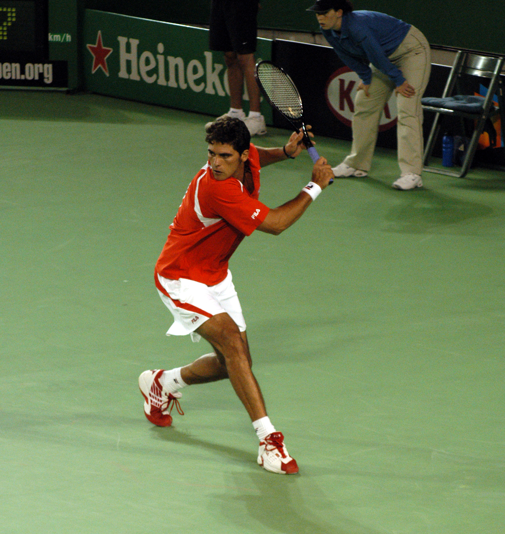 | | | | Mark Philipppoussis drives his backhand. | Mark looked better than he has in years. Hopefully, the nagging injuries he has had in the past few years are behind him. If Mark is ready to be serious and keep physically fit he is ready to start living up to his potential of being a slam winner. |