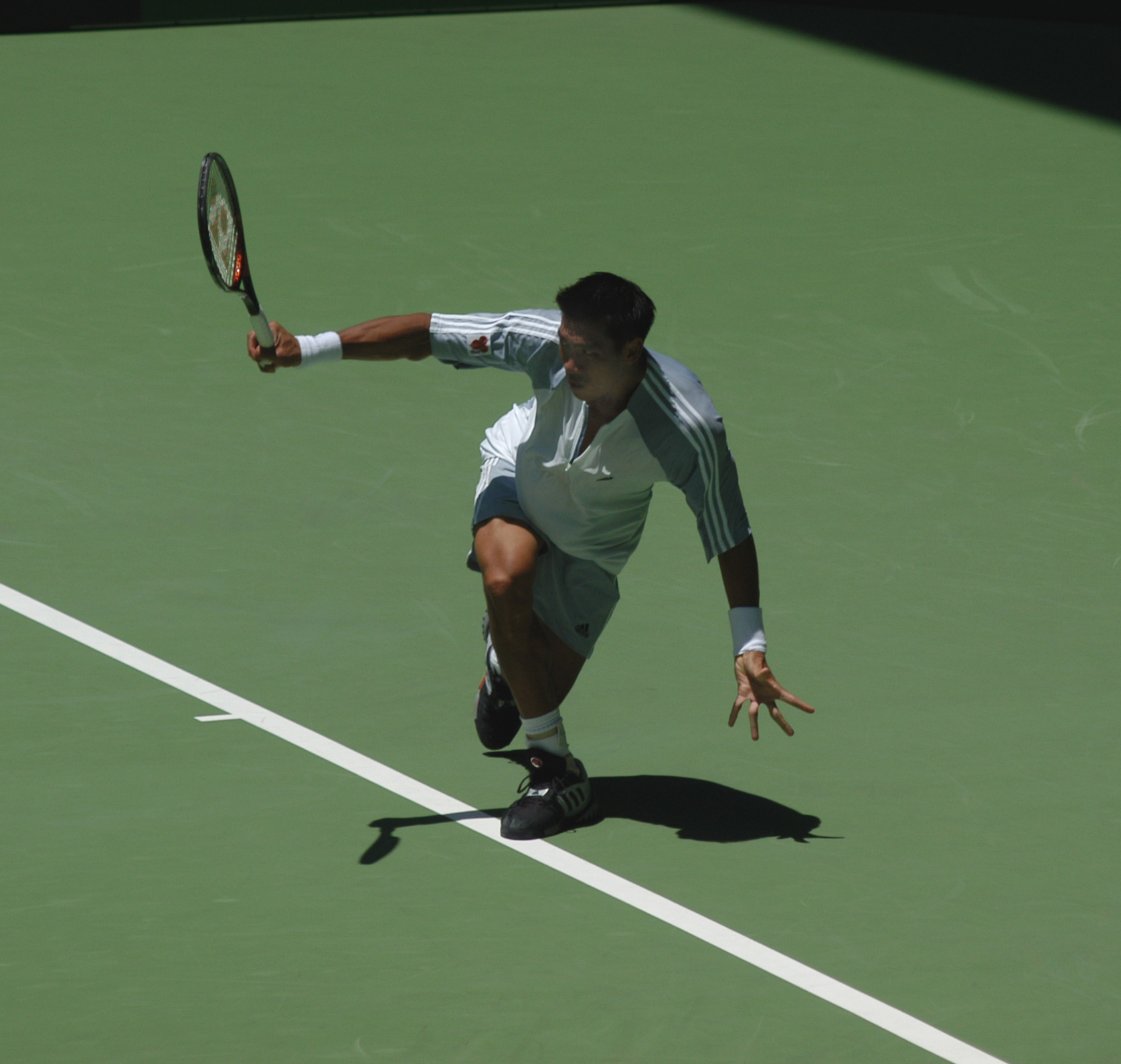 | | | | Andy Roddick working a backhand against Younes El Ayounoui | Andy used a mental timeout to break the concentration of Younes. Giving his racquet to the ball boys at 19-19 in the 5th set broke the mental concentration of El Ayounoui. Younes lost the next game and Andy held to win the match 21-19. |